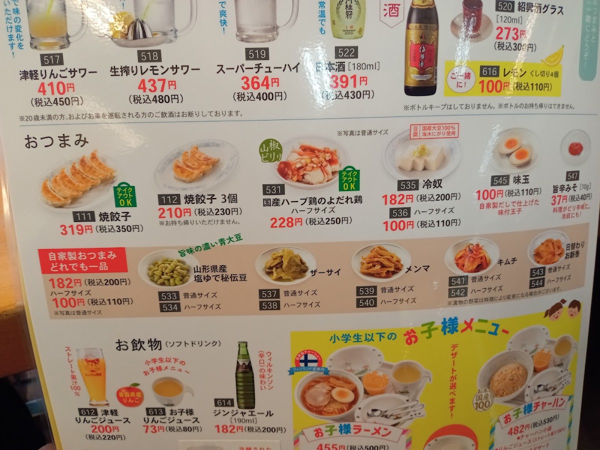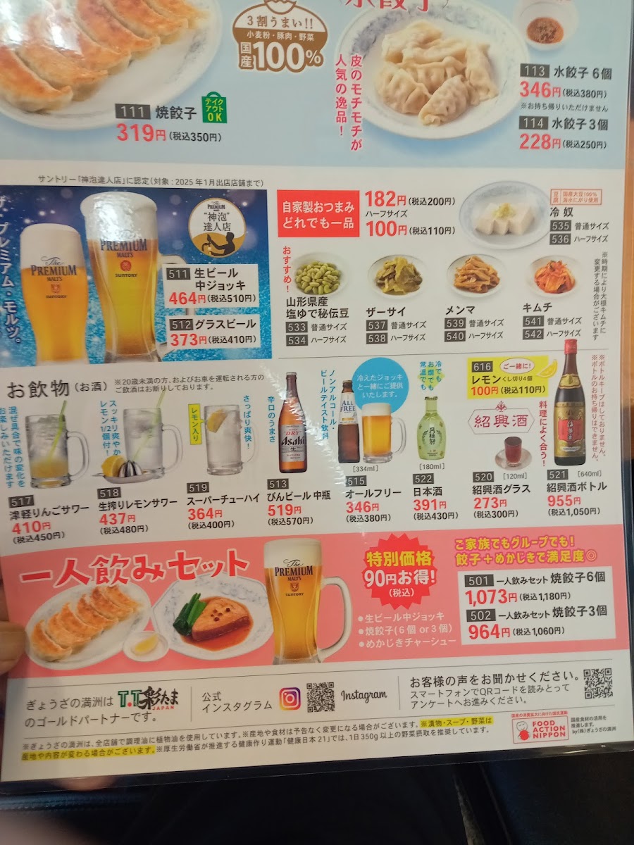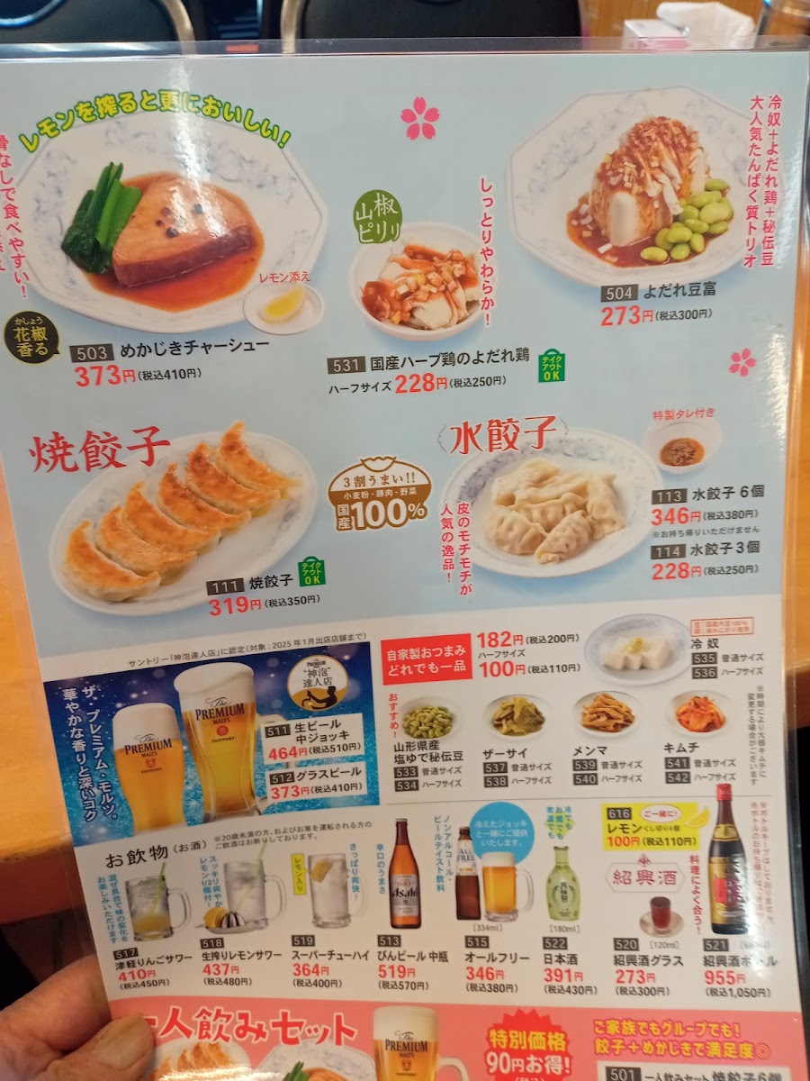 The menu at Gyozanomanshu Hannoekimaeten offers a satisfying variety of flavorful dishes that showcase the restaurant’s expertise in Japanese-style gyoza and hearty ramen. A standout item is the ダブル餃子定食, a double serving of crispy gyoza paired with a side of rice, making it a fulfilling choice for gyoza lovers. For ramen enthusiasts, the もやしラーメン provides a refreshing twist with a generous portion of bean sprouts and a rich, savory broth. The 水餃子, or boiled dumplings, are a delightful, softer alternative to the usual fried gyoza, offering a comforting taste. If you're looking to complement your meal, the 紹興酒 is the perfect choice, offering a smooth, aromatic sip that pairs wonderfully with the dishes. For those with a hearty appetite, the 味噌ラーメン 大盛 焼餃子 features a large bowl of miso ramen with a robust, flavorful broth, complemented by crispy, savory fried gyoza on the side. Each dish at Gyozanomanshu Hannoekimaeten is thoughtfully prepared, offering both variety and authenticity that will leave you craving more.